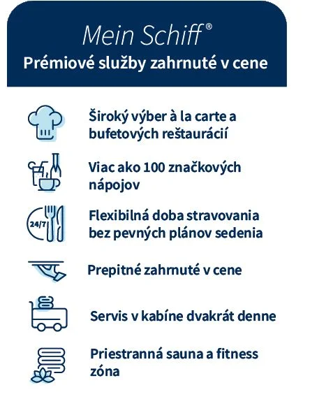 • Plná penzia v à la carte a bufetových reštauráciách na palube