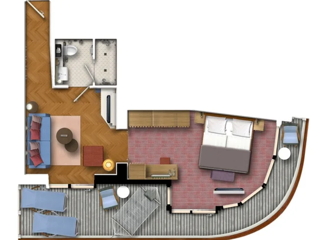 SSAO - Schöne Aussicht Suite 39 m² + balkón 13-14 m² s ležadlami a hojdacou sieťou. 9-10. paluba. Max 4 osoby. Výhody Suite. 13 996 € 3 499 € za osobu