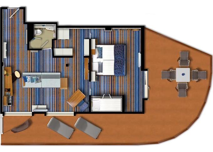 | FVDO - Rodinná kajuta Veranda Deluxe 42 m² + balkón 47 m² so stolom, 4 stoličkami a 2 ležadlami. Hracia konzola. 6. paluba. Max 6 osoby. Cenový model PUR | 6 268 € 1 567 € za osobu | ||